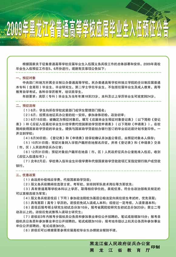 2009年黑龙江省普通高等学校应届毕业生入伍预征公告