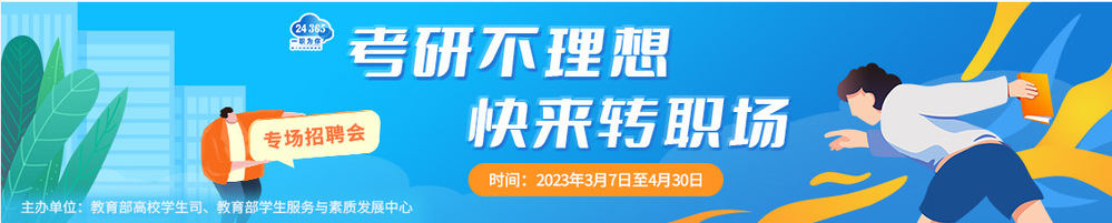 为更好地促进2023届高校毕业生就业,满足企业对2023届毕业生的招聘需求,教育部高校学生司、教育部学生服务与素质发展中心举办“考研不理想,快来转职场”专场招聘会,为考研失利毕业生提供岗位支持!