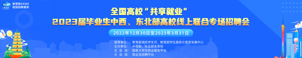 为推动2023届毕业生就业工作,有效调动高校就业资源共享,经中西部、东北部各高校联合决定,举办教育部“24365校园招聘服务” 全国高校“共享就业”2023届毕业生中西部、东北部高校线上联合双选会。