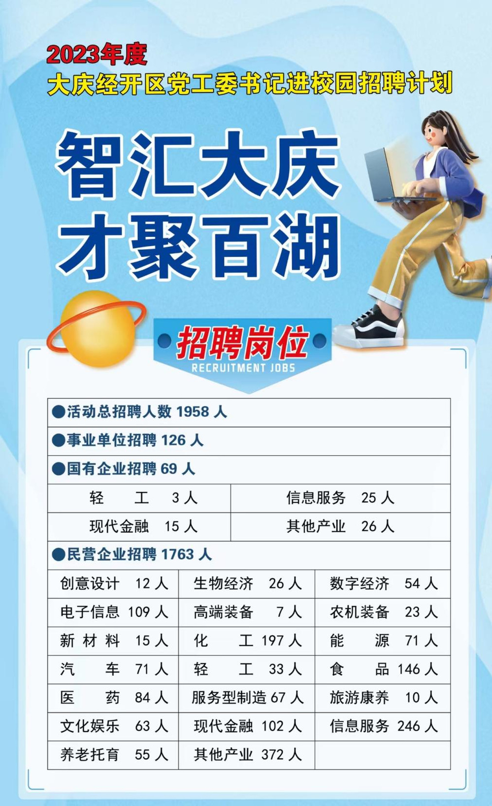 本次活动整合了全大庆市16家事业单位和149家企业人才需求,提供1958个工作岗位,衷心欢迎各位青年学生择业大庆、乐业经开,逐梦未来。