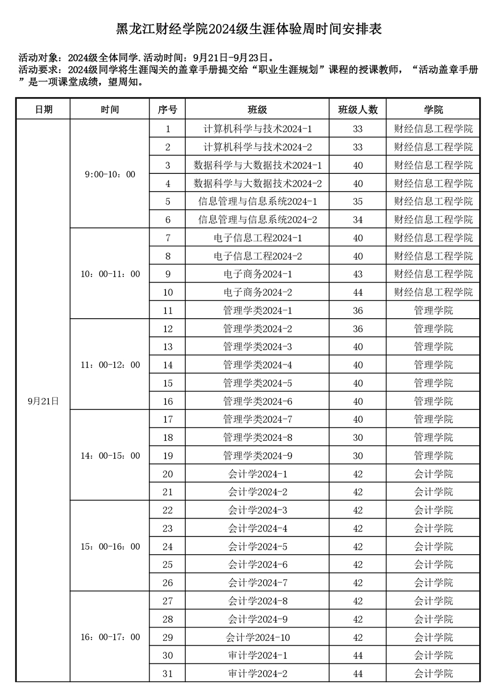 为了帮助全体新生更好地融入大学生活,正确进行学业规划,尽早树立生涯规划意识,学校定于9月21日至23日,举办第一届黑龙江财经学院大学生生涯体验周活动,这是一项大型户外闯关式活动,融娱乐与沉浸式生涯规划体验为一体,目的在于帮助广大新生认清自己、了解专业,感知职业世界,探索职业方向,规划大学学业生涯,立足当下,谋划未来,形成一份专属新生个体的生涯发展指南。现将有关事项通知如下: