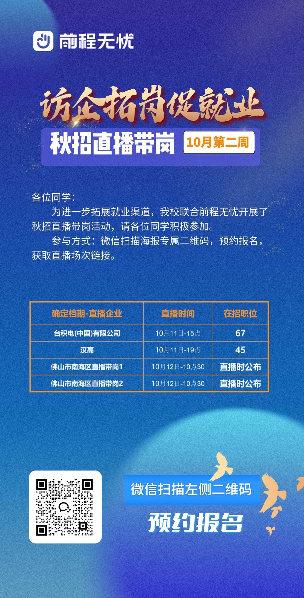 微信扫描海报专属二维码,预约报名,回复秋招直播带岗链接,获取直播场次