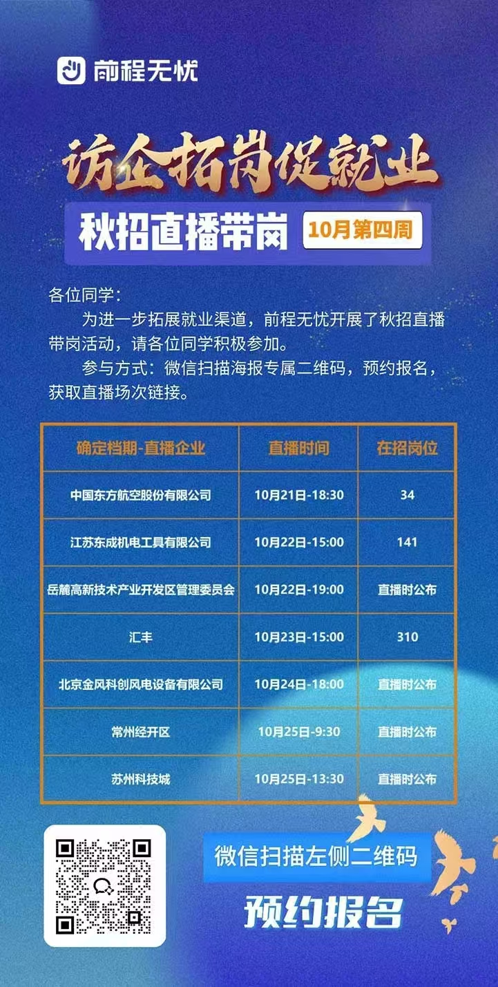 为全面贯彻落实党中央、教育部关于促进高校毕业生就业工作的决策部署,切实做好毕业生就业工作,进一步拓展就业渠道,我校联合前程无忧开展了秋招直播带岗活动。请各位同学积极参加。