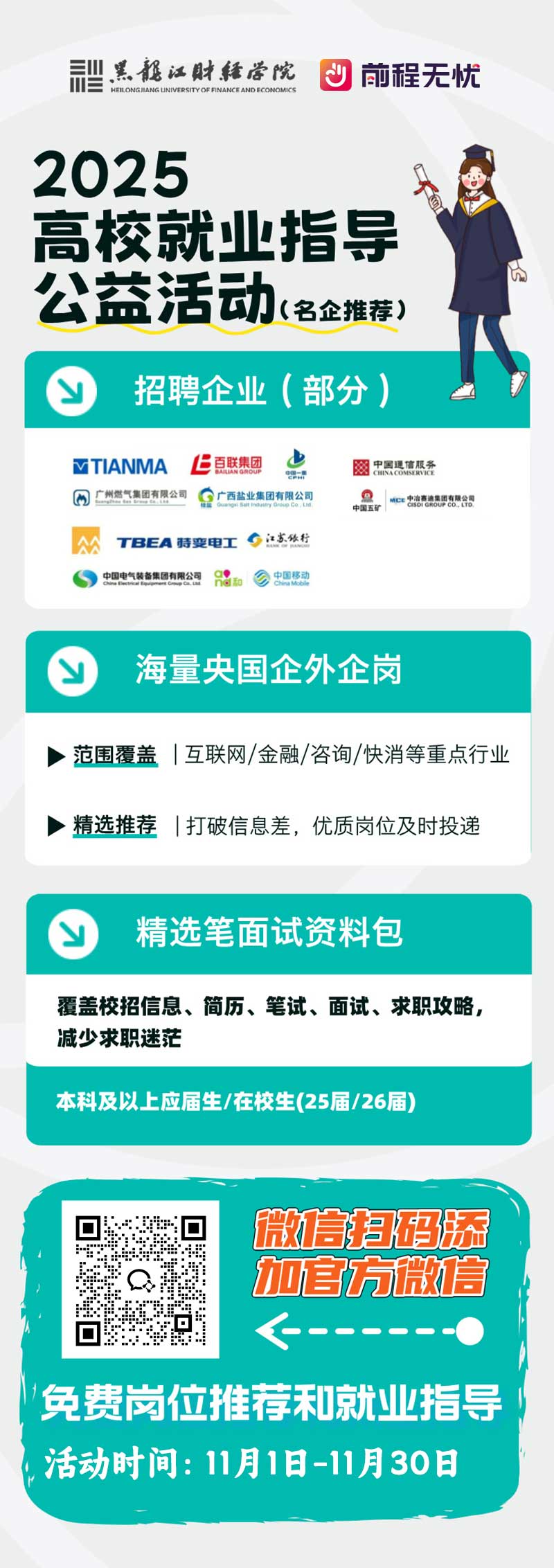 扫描学校专属指导老师二维码,添加前程无忧用于岗位推荐服务的企业号,完善个人简历信息获取1v1精准名企内推及岗位匹配。