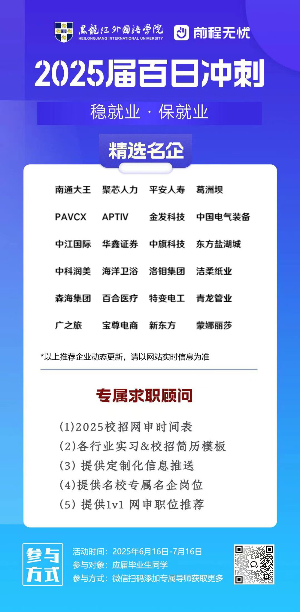 本次活动前程无忧利用自身平台优势、企业资源、就业策划指导团队,为大家提供优质企业岗位,专属名企内推、专属导师1v1、提高学生简历制作水平、行业选择敏感度、岗位匹配精准度、面试熟练度和技巧性,同时增加广大毕业生获得优质offer的机会。