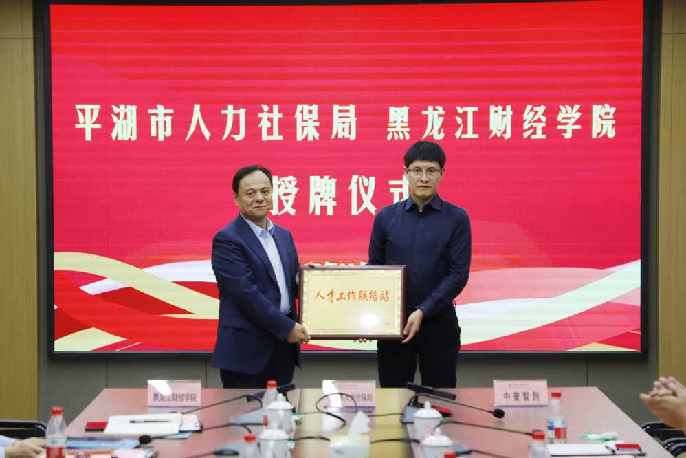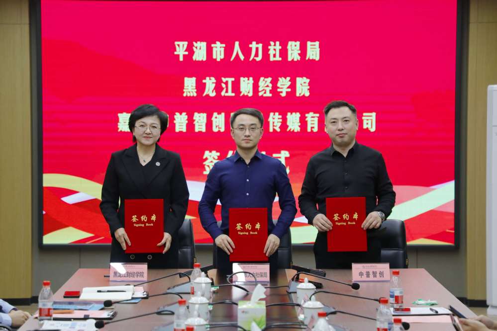 于长福与崔小生共同为“人才工作联络站”揭牌。副校长庹莉与平湖市人力社保局党委书记、局长朱磊,嘉兴中普智创网络传媒有限公司总经理富京磊共同签署《三方战略合作框架协议》。