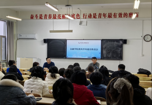 11月12日,金融学院在尚学楼424教室召开教风学风建设推进会,院长郭强主持会议,党总支书记于水、副院长张福双、刘佳宇,全体教师与辅导员参加会议。
