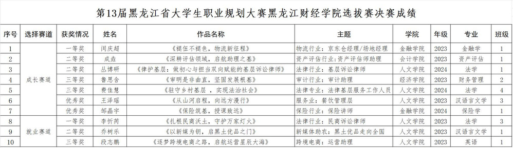 本次大赛是贯彻落实《教育部关于举办第三届全国大学生职业规划大赛的通知》、《关于举办第三届全国大学生职业规划大赛黑龙江赛区选拔赛暨第13届黑龙江江省大学生职业规划大赛的通知》文件精神的积极举措,面向大一至大四全体学生开展,大赛以“筑梦青春志在四方,规划启航职引未来 ”为主题,旨在引导学生树立正确职业规划意识和成才观、就业观,进一步提升学生职业规划与就业创业能力。本次决赛共有10名参赛选手,其中成长赛道7人,就业赛道3人。决赛中,成长赛道参赛选手结合职业目标的岗位认知、职业生涯发展规划、实现职业目标的具体行动和成果等方面进行陈述;就业赛道选手结合求职意向、岗位认知、职业契合度等方面进行陈述,专家评委根据选手阐述进行现场提问,并对选手规划的可行性、职业准备的针对性等方面提出了宝贵意见与建议。