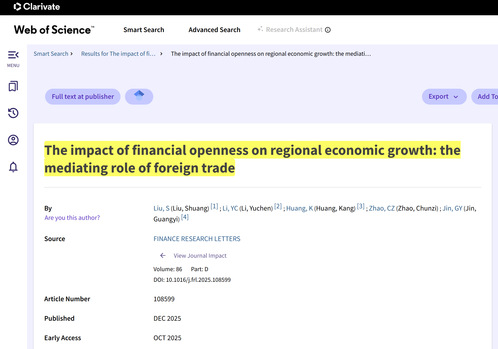 近日,我校经济学院教师刘爽的最新研究成果——论文《The impact of financial openness on regional economic growth: the mediating role of foreign trade》(中文名:金融开放对区域经济增长的影响——以对外贸易促进为中介变量)在国际核心学术期刊《Finance Research Letters》(中文名:《金融研究快报》)上正式发表。该期刊主要发表金融领域原创性研究成果,涵盖资产定价、公司金融等方向,在国际经济学领域有广泛影响力。