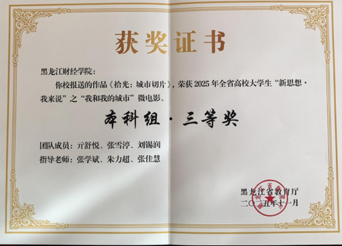 在黑龙江省教育厅主办的2025年黑龙江省高校大学生“新思想·我来说”主题展示活动中,我校马克思主义学院报送的作品《拾光:城市切片》在“我和我的城市”微电影赛道脱颖而出,荣获本科组三等奖。