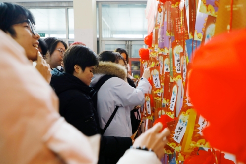 大家纷纷驻足参与,有的独自凝神思索,有的三五成群热烈讨论,当谜底被成功破解,师生们便满怀喜悦地兑换小礼品。猜灯谜环节不仅让师生们在趣味互动中领略了中华文字的独特魅力,更在潜移默化中增进了对传统文化的了解。